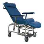 Cozie chair, reclining backrest, adjustable armrest lowers to seat level, das strut controlled adjustment, 4 castors (rear lockable), soft & stretchable incontinent polyurethane, fire